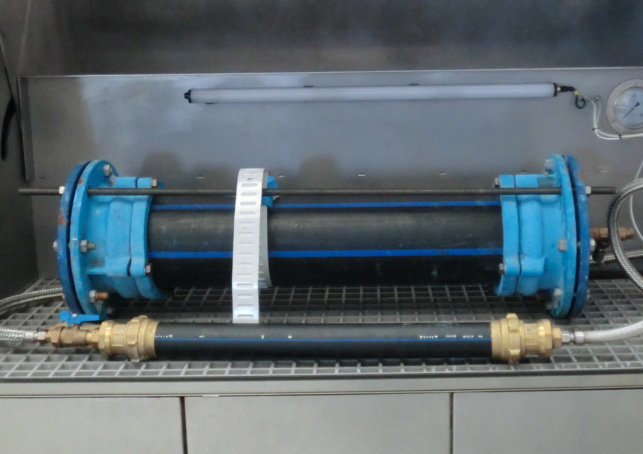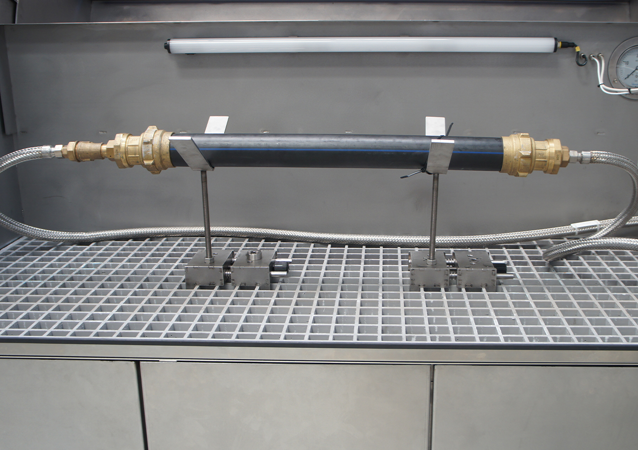 Banco di prova per pressioni statiche e cicliche su tubazioni e condotte (LifeTube): questo banco di prova esegue prove di pressione ciclica con acqua su uno o più prodotti contemporaneamente, per simulare i colpi d’ariete o accelerare l’invecchiamento dei componenti. I profili di sollecitazione (curve, cicli, sequenze) sono configurabili, con spurgo automatico e monitoraggio delle perdite tramite caduta di pressione o rilevamento del flusso.