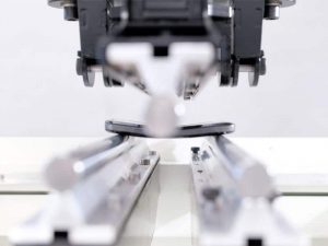 Su questo banco di flessione, l’attrezzo di appoggio scende a velocità rapida fino a trovare automaticamente il contatto con il prodotto testato. Una volta che l’attrezzo entra in contatto con il prodotto, la forza di appoggio aumenta progressivamente secondo una rampa programmabile.